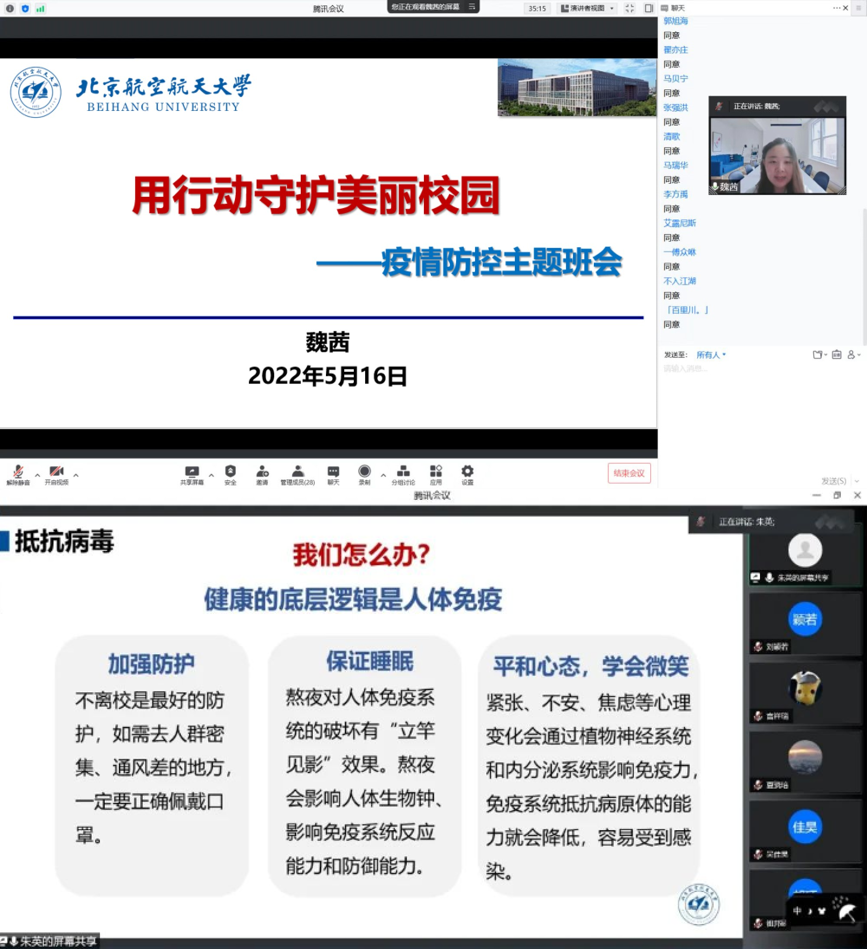 德赢AC米兰中国官方网站班主任、辅导员以“共克时艰,守护美丽校园”为主题面向学院全体学生召开班会,发出拒绝外卖、减少快递、守护美丽校园的倡议,将学校的暖心举措详细告知同学们。同学们纷纷表示,大爱暖心北航,要用行动守护美丽校园。