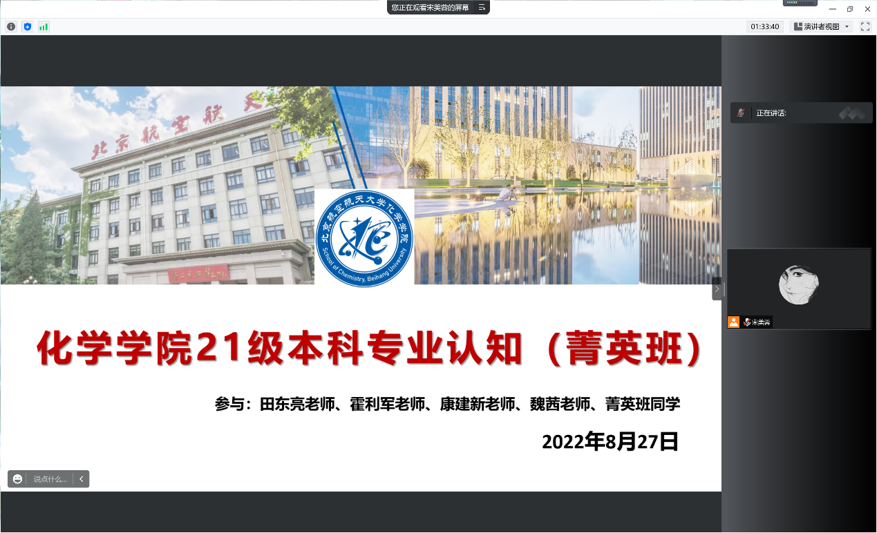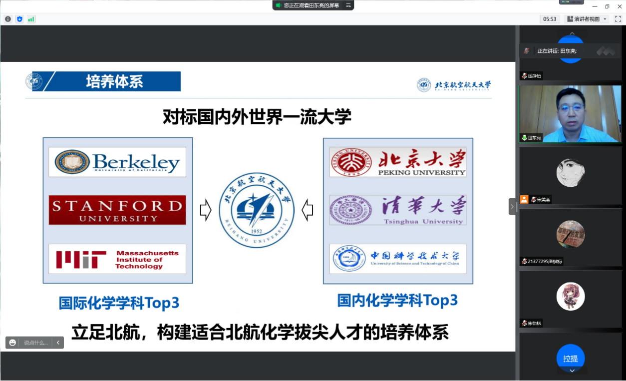 8月28日,德赢AC米兰中国官方网站2021级菁英班开展系列专业认知教育活动。上午9:00,专业认知大会以腾讯会议的形式召开。本科教学副院长田东亮老师、化学生物学专业负责人霍利军老师、应用化学系康建新老师、院团委书记魏茜老师与菁英班全体同学参加了此次会议。
