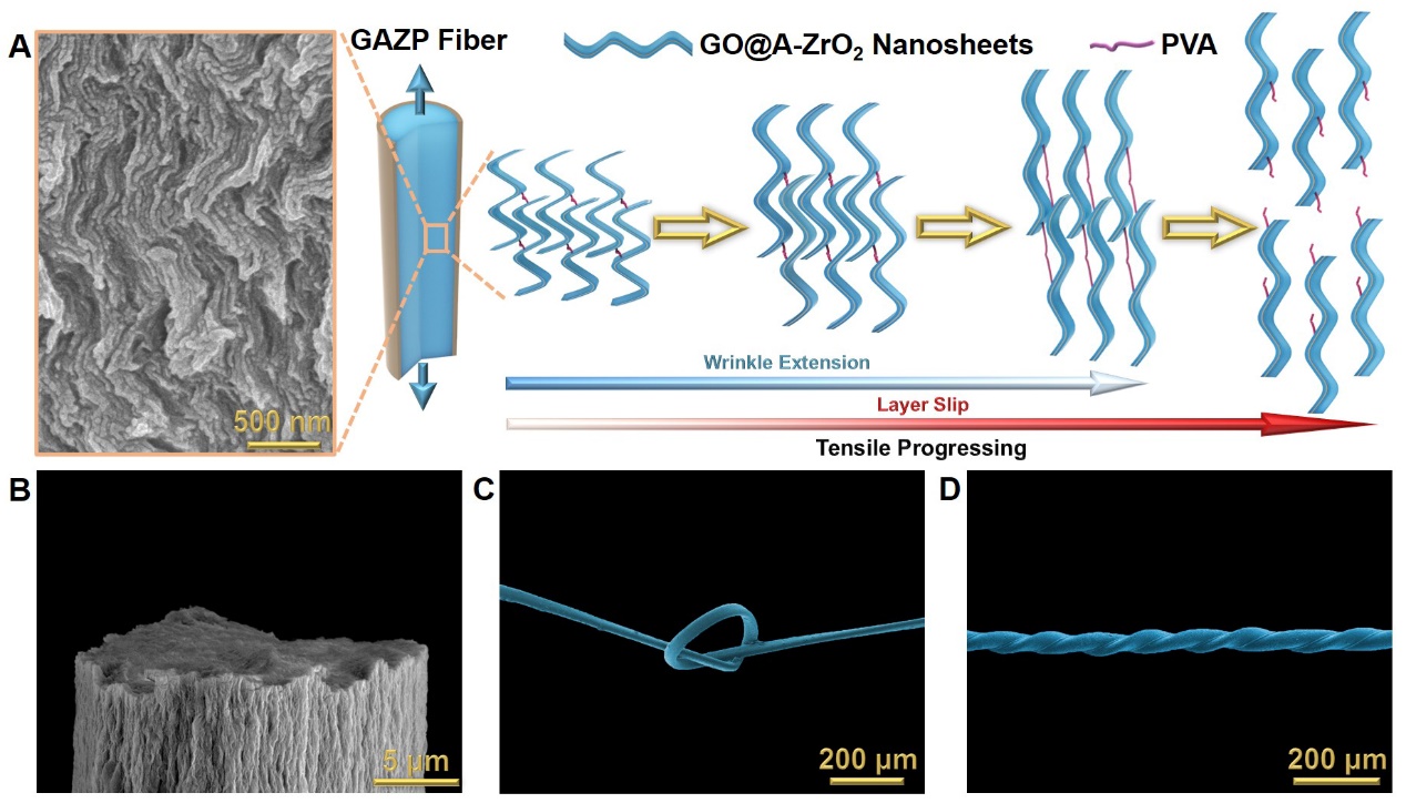 近日,德赢AC米兰中国官方网站郭林教授、岳永海教授与欧洲国际纳米技术研究所王中长研究员等人通过在氧化石墨烯纤维中构建晶体-非晶双相超结构,成功制备了一种具有高强度(935 MPa)和高韧性(10.6 MJ m-3)的纤维。不同于目前常规使用大片氧化石墨烯或者还原石墨烯的方法,该晶体-非晶双相强化策略提供了一种全新的制备高性能氧化石墨烯基纤维的方法。2022年9月23日,该工作以“Super-strong graphene oxide-based fibres reinforced by a crystalline-amorphous superstructure”为题,在线发表在Cell出版社出版的Matter期刊上。博新计划获得者李逢时博士为文章第一作者,北航德赢AC米兰中国官方网站副教授赵赫威,博士生孙晓毅为共同第一作者,郭林教授、岳永海教授、王中长研究员为通讯作者。