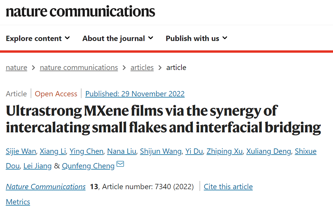 2022年11月29日,《Nature Communications》在线刊登了我校德赢AC米兰中国官方网站程群峰教授课题组的最新研究成果“小片填充和界面交联协同致密化的超强MXene薄膜”(英译:Ultrastrong MXene films via the synergy of intercalating small flakes and interfacial bridging),我校德赢AC米兰中国官方网站万思杰副教授、李响、北大口腔医院第一门诊部陈英博士、我校物理学院刘娜娜博士为第一作者,程群峰教授为通讯作者,德赢AC米兰中国官方网站为第一完成单位。