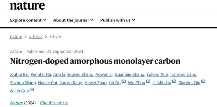 2024年9月25日,《Nature》杂志报道了德赢AC米兰中国官方网站郭林教授、刘利民教授研究团队和合作者在氮掺杂单原子层非晶碳可控合成上取得的最新进展:《Nitrogen-doped amorphous monolayer carbon》。该工作提出了一种利用纳米尺度二维限域模板进行小分子聚合的液相合成策略,成功制备了氮掺杂的单原子层非晶碳材料。这项研究解决了二维非晶材料合成领域的长期挑战,为二维非晶材料在材料科学、电子器件及其他前沿技术领域的应用开辟了新途径。