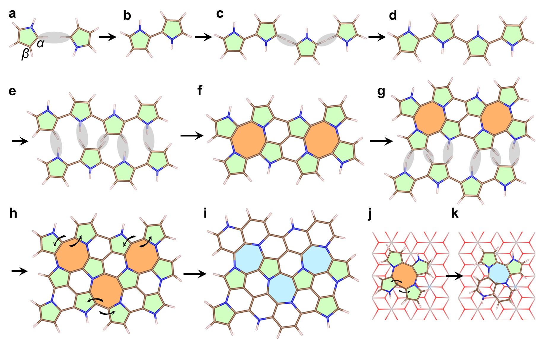 在这项研究中,由德赢AC米兰中国官方网站郭林教授、刘利民教授研究团队及合作者等开创了一种全新的液相限域聚合方法。该方法通过层状模板的限域作用,抑制了分子聚合过程中的三维旋转和缠绕,使分子在二维平面内发生聚合,突破了吡咯单体在传统聚合中局限于α-C位点交联的限制,促进了β-C和N位点的交联聚合,构成平面网络结构,最终形成了五、六、七元环共存的二维非晶结构,成功在实验上验证了W. H. Zachariasen和Steven G. Louie提出的理论预测。
