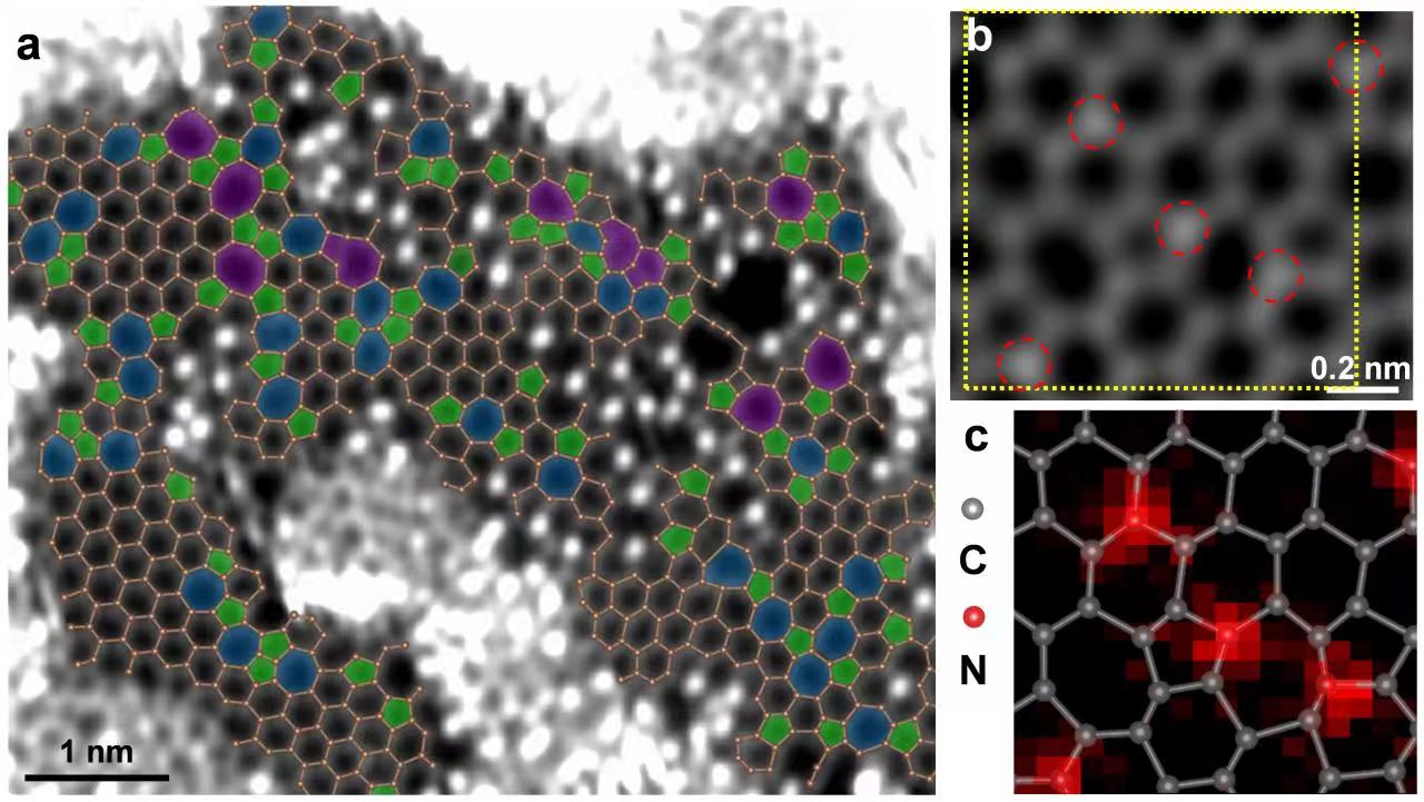 利用低电压扫描透射电子显微镜技术,研究团队精确解析了碳原子和氮原子在二维非晶碳网络中的分布,确认了氮原子嵌入到五、六、七元环混合的二维拓扑网络中,氮掺杂浓度可达9%。光学和电学性质测试表明,该材料具有p型半导体特性,为研究原子掺杂对二维非晶碳材料的电子局域化现象的影响提供了理想的研究平台。
