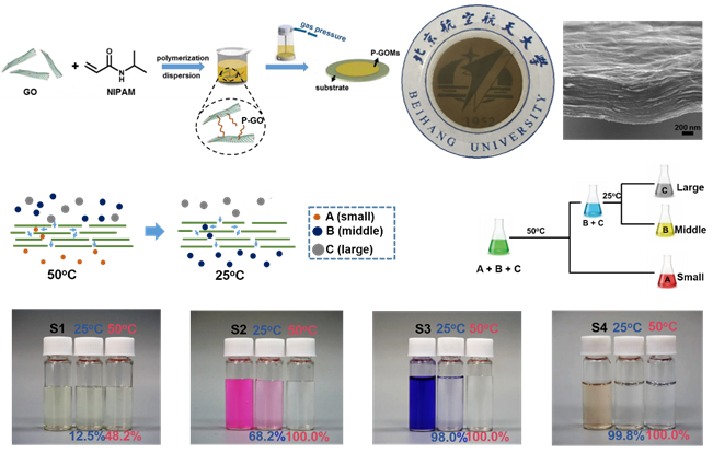 膜分离作为选择性分离领域的一种手段,在工业生产和日常生活中起着不可替代的作用。近年来,快速的城市化和工业化进程,工业污水的肆意排放和洁净生活饮用水的匮乏,让持续枯竭的淡水资源的形势变得愈发严峻。以分离膜技术为代表的解决方案,引起了广泛地关注和重视。我校德赢AC米兰中国官方网站赵勇教授、王女副教授课题组近年来在高效液体分离膜领域取得一系列进展:使用静电纺丝技术结合其它合成手段制备了浸润性可调的纳米纤维膜,可用于高效油污吸附分离(Nanoscale2015,7, 2625);利用二元协同互补理念制备了大通量连续化油水分离器(J.Mater. Chem. A, 2016,4, 4365);使用静电纺丝技术及水热合成的方法,仿生制备了具有树枝状多级结构的无机纤维膜,可实现高效乳液的分离(J.Mater. Chem. A, 2016, 4, 12014;J.Mater. Chem. A, 2017, 5, 16134);通过构筑具有多尺度结构网膜并精确调节其表面能,实现了基于有机液体表面张力差异的非水体系混合有机液体分离(NPGAsia Mater.2016, 8, e334;Small,2017, 13, 4)。在前期多相液体分离膜工作的基础上,赵勇教授、王女副教授课题组进一步制备了具有仿生温度响应的石墨烯分离膜用于水门控及混合分子分离。在之前研究中,氧化石墨烯分离膜的孔径无法实现简单的原位调控,从而限制了其应用。该工作从自然界中获得灵感,模仿植物(如仙人掌)叶片在高温下气孔关闭调节水蒸发通量从而维持生命这一功能特性,仿生构筑了“高温闭孔,低温开孔”的氧化石墨烯膜。作者通过自由基聚合反应将温敏性高分子聚(N-异丙基丙烯酰胺)与氧化石墨烯共价连接,制备了孔径可受温度原位调控的氧化石墨烯分离膜。该分离膜在纳滤尺度上表现出优异的性质,并且通过其温度响应性质可实现不同尺寸混合分子的梯度分离。此研究拓展了智能响应分离膜的应用领域,为水净化、精细化工分离等提供了新的处理思路,同时该膜在微流控及智能反应器领域均有着潜在的应用。