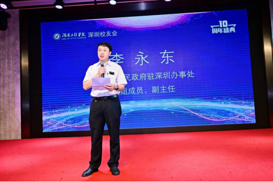 湖南省人民政府驻深圳办事处党组成员、副主任李永东致辞。他表示,将努力为校友们提供全方位的支持与服务,推动校友企业的发展与壮大,助力“校友回湘”工程;将继续加强与校友会的沟通合作,为校友们提供政策咨询、市场信息等各方面的帮助,助力校友企业在深圳的发展壮大;将继续积极牵线搭桥,促进校友企业与湖南的项目对接,推动更多优质项目落户湖南,实现双方互利共赢。同时,希望各位校友能够积极多宣传湖南、多推介湖南,吸引更多的大湾区企业和人才到湖南投资兴业,为实现“三高四新”美好蓝图贡献力量。