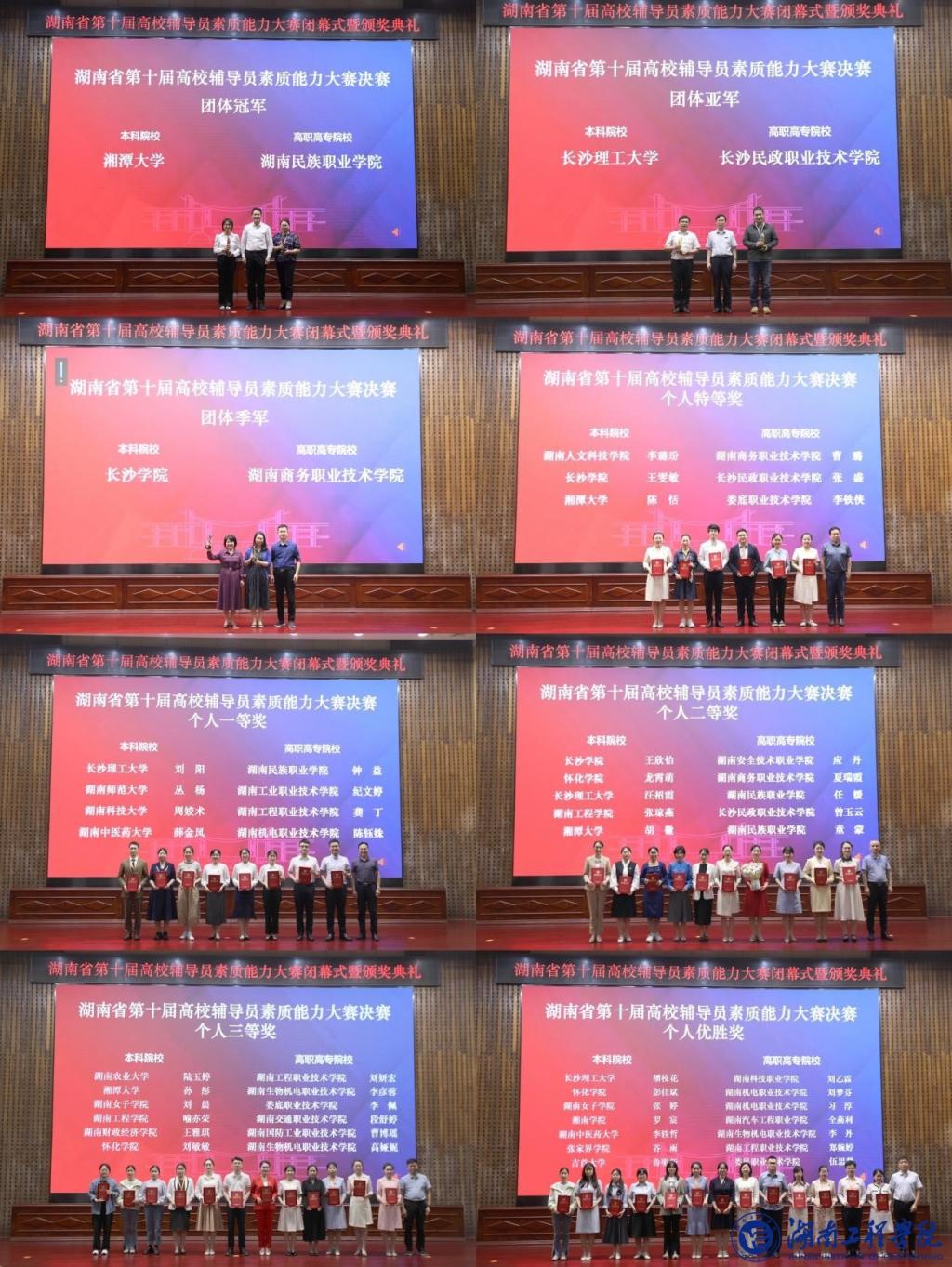 经过2天激烈角逐,湘潭大学、长沙理工大学、长沙学院分别获决赛本科院校组团队冠、亚、季军;湖南民族职业学院、长沙民政职业技术学院、湖南商务职业技术学院分别获决赛高职高专院校团队组冠、亚、季军。决赛还决出个人特等奖、一等奖、二等奖、三等奖、优胜奖共50项。