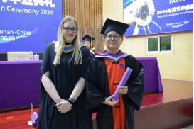 Veronica Lynch博士致辞。她热烈欢迎所有毕业生加入UHI校友大家庭,并欣喜地分享了UHI近年来荣获的新成就。她把两校的合作办学机制、家庭、社会比喻成一个紧密相连的生态系统,这个系统给予了青年学子精心的呵护和全力的支持,让他们从小树苗茁壮成长为参天大树。她希望毕业生们珍惜大学的土壤、家庭的华盖、产业的布局,向下扎根,向上生长,成为卓越的知识管家、思想传播者及工程师。