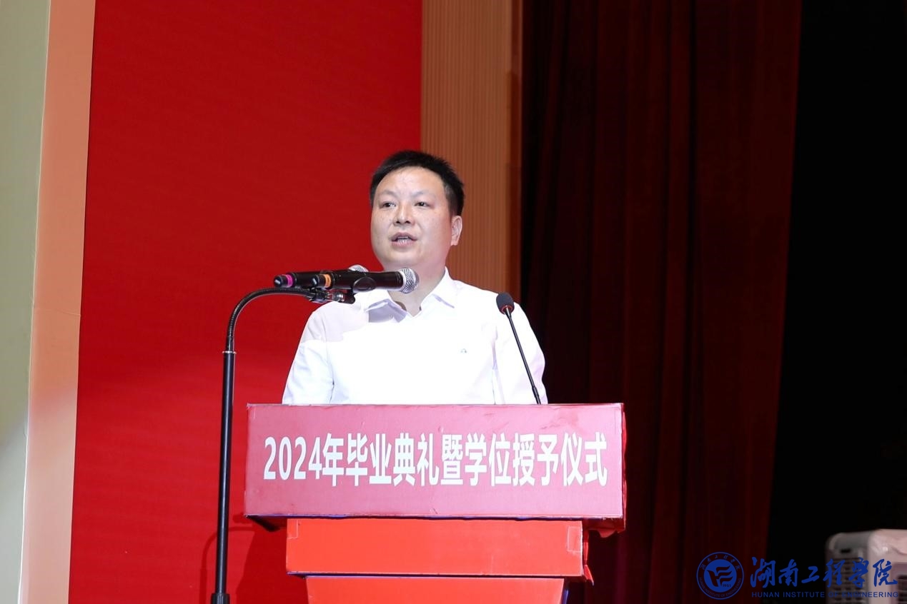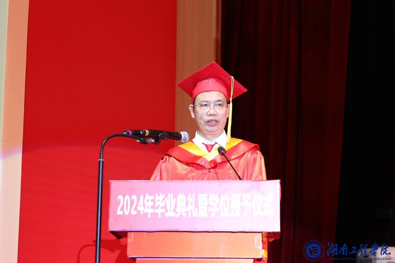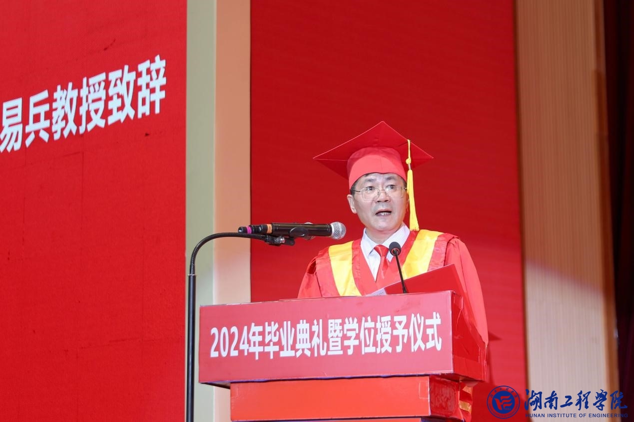 易兵向毕业生们送上热烈的祝贺和美好的祝福,并作题为《让青春与新质生产力双向奔赴》的讲话。根据“在这个可为的时代,湖工学子如何发挥这些特质,乘势而上、顺势而为”这一提问,他分享了三句话:首先,要有理想,向高而攀;其次,要敢担当,向新而行;第三,要增本领,向优而进。易兵深情寄语同学们,惟愿你们“一蓑烟雨任平生”,不惧风雨,豁达前行,攀越更高的山,抵达更远的路,实现更美的梦!