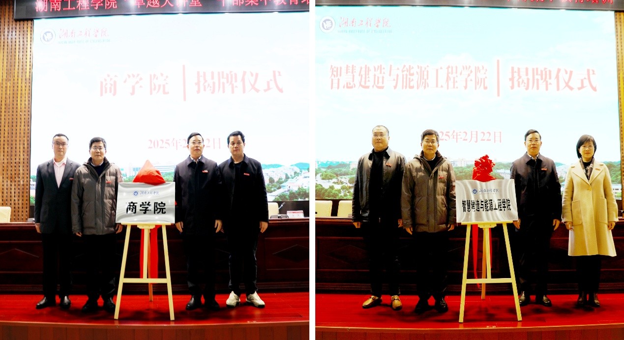 会前,学校举行了商学院、智慧建造与能源工程学院揭牌仪式。全体与会人员共同见证揭牌时刻。