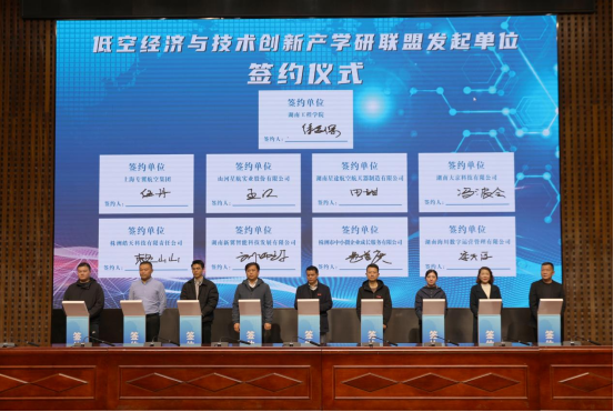 校党委书记黄昕,校党委副书记、校长易兵,湘潭市委宣传部副部长、市社科联党组书记、副主席李锋,学校低空经济与技术创新研究院执行院长徐运保共同为低空经济与技术创新研究院揭牌。校党委委员、副校长张小刚参加并见证签约时刻。学校联合上海专翼航空集团、山河新航实业股份有限公司、湖南星途航空航天器制造有限公司、湖南新翼智能科技发展有限公司等省内外8家低空经济领域代表企业共同发起成立了湖南低空经济与技术产学研联盟,并现场签约。株洲市芦淞区人民政府、湘潭大学、长沙理工大学、湖南科技大学、湖南工业大学、湖南理工学院等单位作为联盟指导单位参加会议。taptap点点低空经济与技术创新研究院专兼职研究员、相关部门及教学院负责人和师生代表共同见证。揭牌和签约仪式由校党委委员、副校长魏克湘主持。