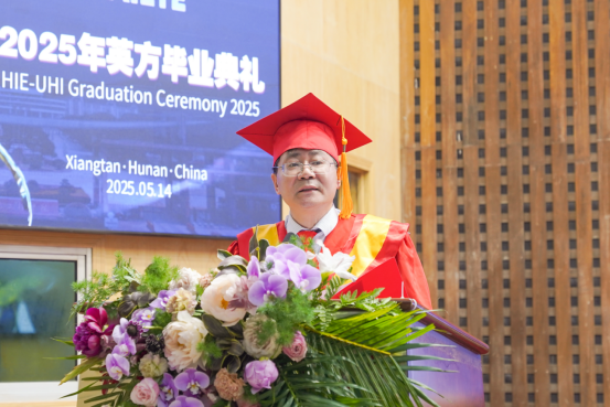 UHI珀斯校区课程总监Nicholas Inglis教授代表珀斯校区校长Margaret Cook博士致闭幕辞。他表示,在中英合作办学体系下,两校、家庭与社会如同共生系统——两校联合培育专业根基,家庭滋养精神成长,产业联通实践机遇。他勉励毕业生以“专研技术、传播文化、推动创新”为使命,永葆求知热忱、永攀学术与技术高峰,从应用型人才成长为行业引领者,在全球工程领域书写新篇章。