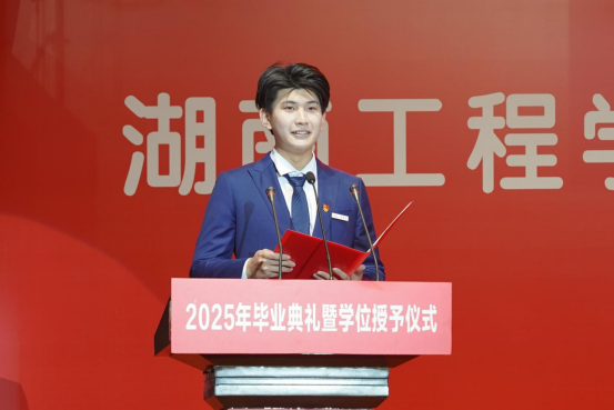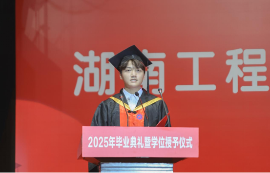 机械工程学院陈淇作为毕业生代表分享感悟。他回顾了在湖工求学四载的成长点滴,感谢母校和老师们用智慧与爱指引他们前行,希望大家做有红色底蕴的工程师、做有温度的创新者,把祖国的需要永远作为自己的第一志愿。