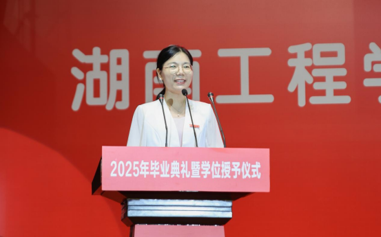 智慧建造与能源工程学院汤丹作为教师代表发言。她带领毕业生们重走湖工三条路,并勉励寄语大家:重走“学海路”,永葆求知之心;漫步“至善路”,做“长期主义者”;踏上“福星路”,追寻幸福生活。