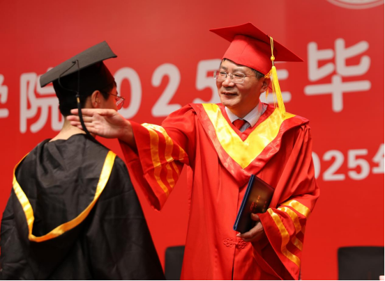毕业典礼上,全体校领导为获奖毕业生代表颁奖。2025届毕业生身着整齐的学位服,满怀激动之情,接受正冠、拨穗。