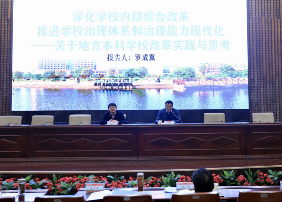 2月27日上午,学校在一报告厅举行主题为“深化内部综合改革,推进学校治理体系现代化——地方本科高校改革实践探索与思考”的辅导报告,这也是此次干部培训专题报告会的第二场。报告会邀请湖南城市学院党委书记罗成翼担任主讲,党委书记陈岳堂主持。