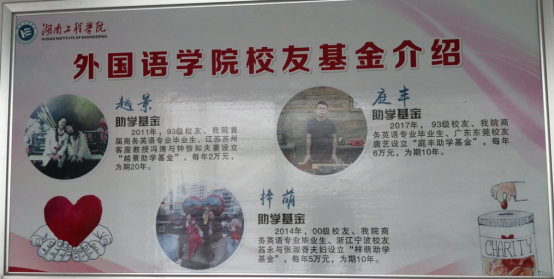 学院共有五大校友基金,两大企业助学金。2011年,江苏苏州校友冯涛与钟信知设立“越景助学基金”(40万元);2014年,浙江宁波校友苏永与张淑香夫妇设立“梓萌助学基金”(50万元);2017年,广东东莞校友唐艺设立“庭丰助学基金”(60万元);2019年,湖南湘潭校友杨杰设立“桑尼森迪-洋塑助学基金”(100万元);2019年,经贸英语96级校友设立“外国语学院经贸英语96校友基金”(16.8万元)。2018年,洋光二外董事长刘红平设立“洋光二外助学金”(3万元/年);2019年,隆吉酒店总经理冯维设立“隆吉助学金”(2万元/年)。七大基金每年颁发30余万元,为品学兼优的学子加油,为学院的发展助力,为校友工作添彩。