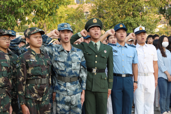 “我是中国人民解放军军人,我宣誓:服从中国共产党领导,全心全意为人民服务……”校退伍复学学生代表和退伍职工代表整齐列队,重温军人誓词,回忆峥嵘岁月。“作为新时代青年,我们要铭记振兴中华、强国富民的历史职责,缅怀先烈、奋发图强,锲而不舍、敢为人先,在为人民利益的不懈奋斗中书写人生华章!”退伍老兵卢亮同学发表“爱我国防”主题演讲。一声声嘹亮的宣誓,凝聚着浓浓的军旅情结;一句句铿锵有力的话语,彰显了老兵们立志报国的坚定决心。
