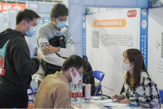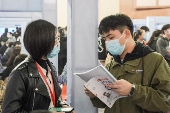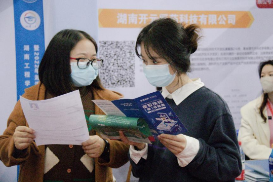 上午九时,参会人员扫码签到、测量体温、出示健康码为绿码后依次进入会场。会场中人头攒动,气氛热烈,井然有序。同学们拿着精心准备的简历穿梭于各个展台间,与用人单位沟通交流,主动了解招聘岗位的具体情况并递投简历。各企业招聘负责人热情地向毕业生介绍招聘岗位相关情况,耐心细致地为学生答疑解惑,结合应聘者自身情况提出针对性建议。