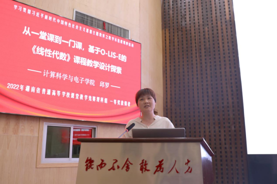 2022年湖南省普通高等学校教师课堂教学竞赛理科组一等奖获得者、计算科学与电子学院邱罗老师以“从一堂课到一门课,基于O-LIS-E的《线性代数》课程教学设计探索”为题,分享了从课堂教学到教学竞赛不同场景下其创新教学理念、教学设计、教学内容、课程思政、教学组织、教学反思,基于O-LIS-E的《线性代数》课程教学模式,推进课程建设的经验。