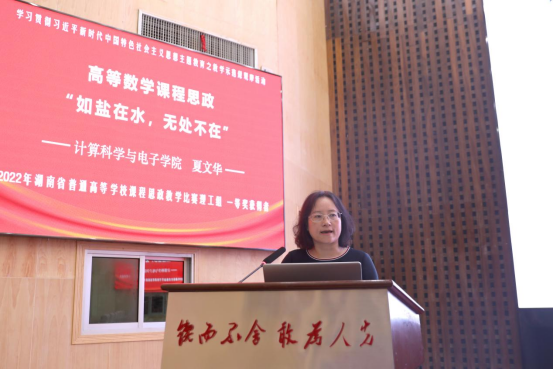 2022年湖南省普通高等学校课程思政教学比赛理工组一等奖获得者、计算科学与电子学院夏文华老师以“高等数学课程思政‘如盐在水,无处不在’”为题,对高等数学课程思政策略予以阐述,并以示例方式展现课堂教学中高等数学课程思政如何进行、如何做到“如盐在水,无处不在”、如何实现课程思政“春风化雨,润物无声”。