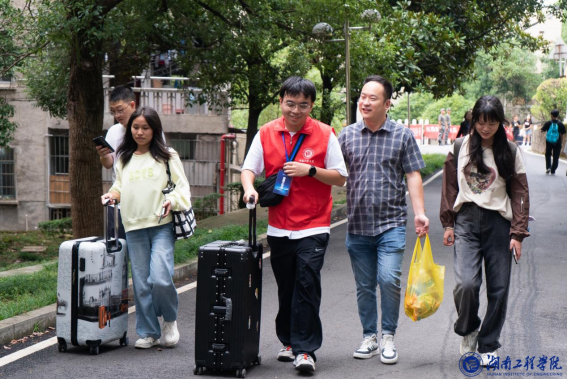 在各学院迎新点前,不少新生正在办理入学报到手续。“同学需要帮忙搬行李吗?”“同学,我带你去找宿舍楼吧”……校园各处都能看到志愿者们忙碌的身影:引导新生、搬运行李、答疑解惑……这样的“一条龙式”服务,极大程度提高了新生入学效率。在服务过程中,志愿者们会热心为新生介绍校园、讲解学习生活各方面的情况,新生们也在志愿者身上感受到了第一份来自湖工的温暖。
