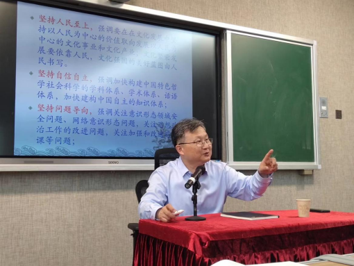 郝立新教授从习近平文化思想的丰富内涵、习近平文化思想的重大创新、文化自信、核心价值观、“两个结合”、中华民族现代文明等六个方面对习近平文化思想作了深刻、系统的阐述。郝立新教授表示,习近平文化思想是新时代党领导文化建设实践经验的理论总结,是对马克思主义文化理论的丰富和发展,是习近平新时代中国特色社会主义思想的文化篇。这一思想以马克思主义为魂,以中华优秀传统文化为根,以文化发展的创新实践为基础,以建设包括中华民族现代文明在内的社会主义先进文化为任务,以推进文化强国、民族复兴为使命。习近平文化思想是习近平新时代中国特色社会主义思想的重要组成部分,它植根于新时代中国特色社会主义实践,代表了马克思主义中国化时代化在文化思想领域的最新成果,开辟了马克思主义文化理论发展的新境界。
