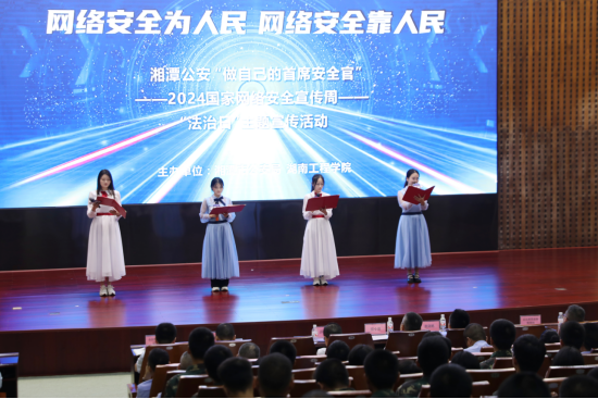 活动中,来自湘潭大学计算机学院的同学结合身边的真实案例,以《青年说“网海冲浪、安全为先”》为题,用脱口秀的形式,为大家揭示了网络安全的重要性;岳塘公安分局的反诈民警用一首改编歌曲《爱情买卖》为大家揭示了“杀猪盘”等常见网络诈骗套路;taptap点点学生用一首诗歌朗诵《安全与法治》,讲述了安全与法治的关系,并号召大家一起学法懂法用法,共同构筑起生活的坚固防线。