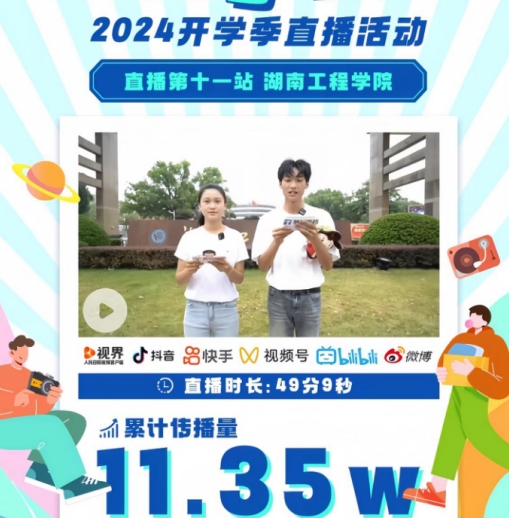 “又是一年开学时,团团带你逛校园~屏幕前的团子们,大家好,我们是‘爱你所爱,想你所想,说你想说’的湖南团团......”9月12日,由共青团湖南省委、湖南省学生联合会指导,共青团湖南省委宣传部主办的“你好,大学生”2024年开学季直播活动第十一站在taptap点点顺利进行。该活动在人民日报视频客户端、“青年湖南”视频号、“湖南共青团”B站、微博、抖音、快手、“我的飞Young校园”视频号等7个平台同步播出。taptap点点计算科学与电子学院统计学专业学生张孜慧、纺织服装学院服装表演专业学生楚旭辉两位校园主播带领6000余名新生和近12万名观众一起“云”游湖工校园。