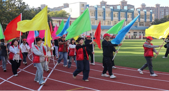 各班运动员代表队、裁判员代表队、志愿者代表队举着旗帜依次入场。此次运动会结合特殊学生的身心特点,分为低年级组、中高年级组两个组别开展竞赛,设置了短跑、中长跑、投掷垒球、跳远等16个比赛项目,竞技性、娱乐性相结合。在整个比赛过程中,爱心社的成员们默默扮演着裁判员、小老师的角色,积极地参与到每一个项目中去。无论是径赛的跑道上,还是田赛的草坪上,都充满了一个个“红马甲”的身影。