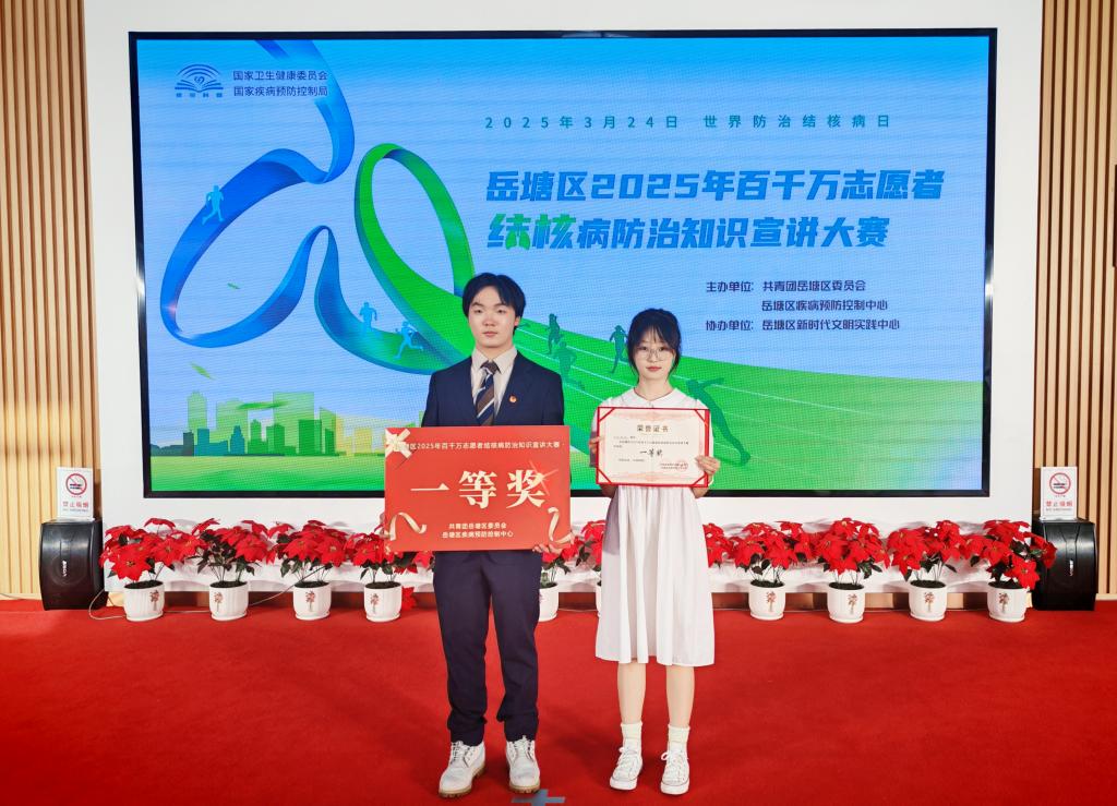 3月24日下午,由共青团岳塘区委员会、岳塘区疾病预防控制中心联合主办的岳塘区2025年百千万志愿者结核病防治知识宣讲大赛在岳塘区新时代文明实践中心举行。taptap点点由“五彩湖工”志愿者、校红十字协会会员何昊城、向苗苗等6人组成的团队获大赛一等奖。