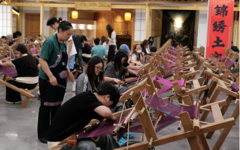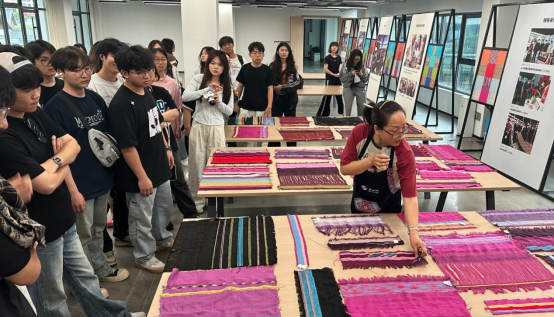工坊试制环节,学生们在乖幺妹土家织锦开发有限公司(以下简称乖幺妹织锦公司)总经理张甜甜的指导下,用手触摸丝线的温度,感受织机经纬编织的魅力。土家织锦织娘们手把手教授平纹、斜纹提花传统技艺。学生在前期武陵源土家织锦田野考察基础上,尝试将现代创意设计理念融入织锦作品中。