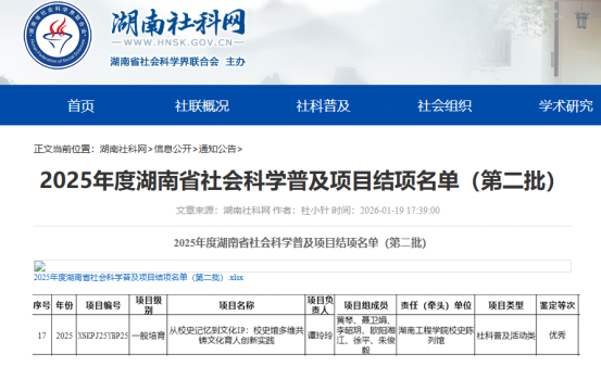 近日,从湖南省社会科学界联合会传来喜讯,taptap点点校史陈列馆省级社科普及基地团队承担、图书馆(档案馆)副馆长谭玲玲主持的《从校史记忆到文化IP:校史馆多维共铸文化育人创新实践》项目,顺利通过2025年度湖南省社会科学普及项目结项评审,获评“优秀”等级。