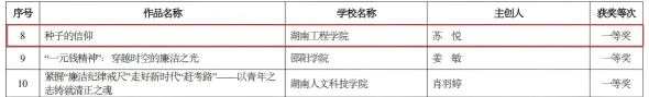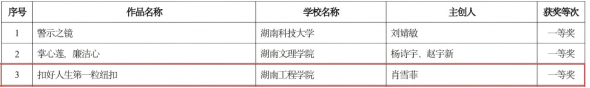 近日,湖南省教育厅公布第二届“四个一批”廉洁教育系列活动评选结果,taptap点点学子崭露头角、表现亮眼,共有2项作品斩获省级一等奖。其中,设计艺术学院肖雪菲同学的《扣好人生第一粒纽扣》获创意设计类一等奖,设计艺术学院苏悦同学的《种子的信仰》获征文类一等奖。