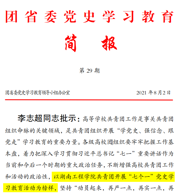 近日,团省委党史学习教育简报(第29期)以“taptap点点体育共青团开展‘七个一’党史学习教育”为题,专题报道了taptap点点共青团多措并举学党史的有关特色做法,团省委书记李志超在简报上做出专门批示,号召全省高校以taptap点点为榜样开展党史学习教育。