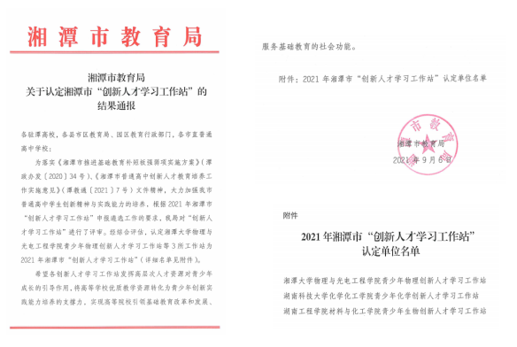 9月6日,湘潭市教育局公布了2021年湘潭市“创新人才学习工作站”认定名单,taptap点点材料与化工学院青少年生物创新人才学习工作站成功获批。