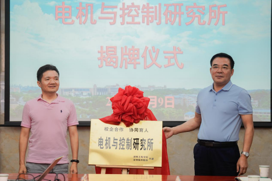 随后,陈岳堂和马伟共同为电机与控制研究所揭牌,并为企业颁发捐赠证书。双方就人才培养、科学研究、校企合作等方面进行了深入的沟通与交流。