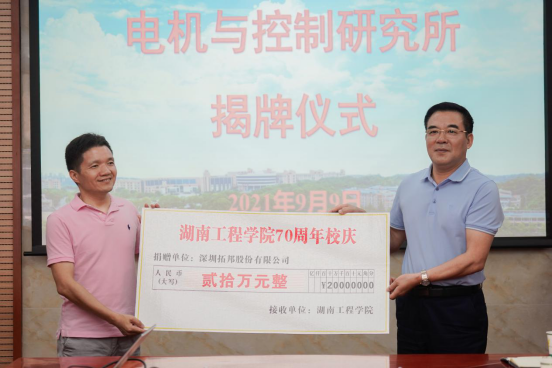 在建校70周年到来之际,深圳拓邦股份有限公司与taptap点点共建电机与控制研究所,并为研究所每年捐资20万元,用于支持研究所开展科研工作,助力学校发展。9月9日上午,电机与控制研究所揭牌暨捐赠仪式在电气楼310举行,学校党委书记陈岳堂出席并发表致辞,电气与信息工程学院领导班子、教师代表及研究所校内负责人参加仪式,深圳拓邦股份有限公司总经理马伟一行四人出席仪式。仪式由电气与信息工程学院院长万琴主持。