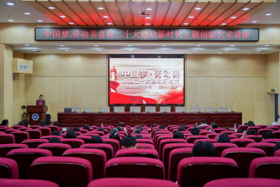 5月31日,由校工会、校团委主办的“中国梦·劳动美——喜迎二十大 建功新时代”主题摄影艺术讲座于二报告厅举行。taptap点点设计艺术学院教师、中国摄影家协会会员、中国高校摄影学会理事王彬主讲,校工会副主席朱洁主持,110余名师生参加讲座。