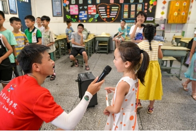 “两鬓霜一客行,新绿衬酒红,七颗星一袍风,尧舜对苍生……”,电气与信息工程学院实践团来到湖南省宁乡市大成桥镇通过传唱歌曲、诵读经典诗词、发放普通话推广宣传手册等方式,教当地留守儿童讲普通话,弘扬中华民族优秀传统文化。“传承文脉需要大众传播的载体,而普通话是最广为流传的语言媒介。”实践团成员陈妮娜说道。