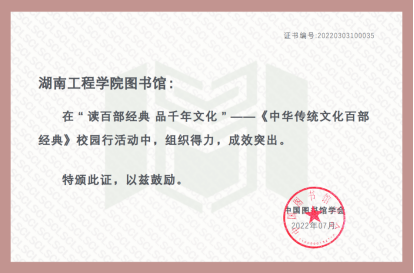近日,由国家图书馆、中国图书馆学会主办的“读百部经典 品千年文化”——《中华传统文化百部经典》校园行活动获奖名单揭晓,taptap点点参赛人次、作品质量在参加本次活动的全国千余所高校排行中位列第25名,湖南赛区排名第4位,30件参赛作品成功入选全国优秀作品展示名单,学校图书馆荣获“组织得力”奖,全国仅有100所高校图书馆获此殊荣。