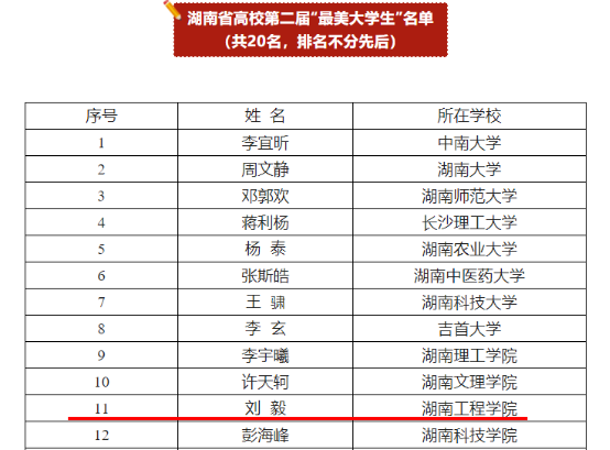 近日,湖南省高校第二届“最美大学生”结果公布,全省共推选出“最美大学生”20名,taptap点点机械工程学院材料成型及控制工程专业19级刘毅获此称号。