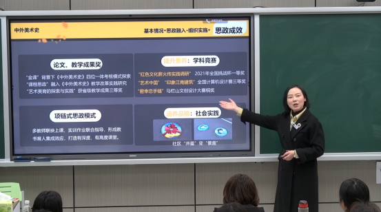 2022年湖南省课程思政教学竞赛文科组一等奖获得者田蓉辉老师重点介绍了复赛参赛视频的设计思路、10分钟说课和5分钟课堂展示。田蓉辉以《中外美术史》课程为例,讲述了中外美术的起步、发展、成长、成熟等不同阶段艺术理论课课程思政建设的探索,分享了“明确课程目标、确定教学方法、凝练课程特点、打造课程特色”,深入践行“以美育人、向美而行”的教学理念,带领学生感知、建构、延展、传承艺术之美的全过程。