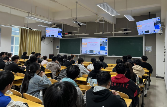 本次授课依托taptap点点新建的14间智慧互动型教室,首次采取“1主讲课堂+13听讲课堂”教学模式。在主讲教室,侧边屏幕能显示出听讲教室学生的画面,同时教师讲课的镜头和PPT画面也实时传送到了13间听讲教室。