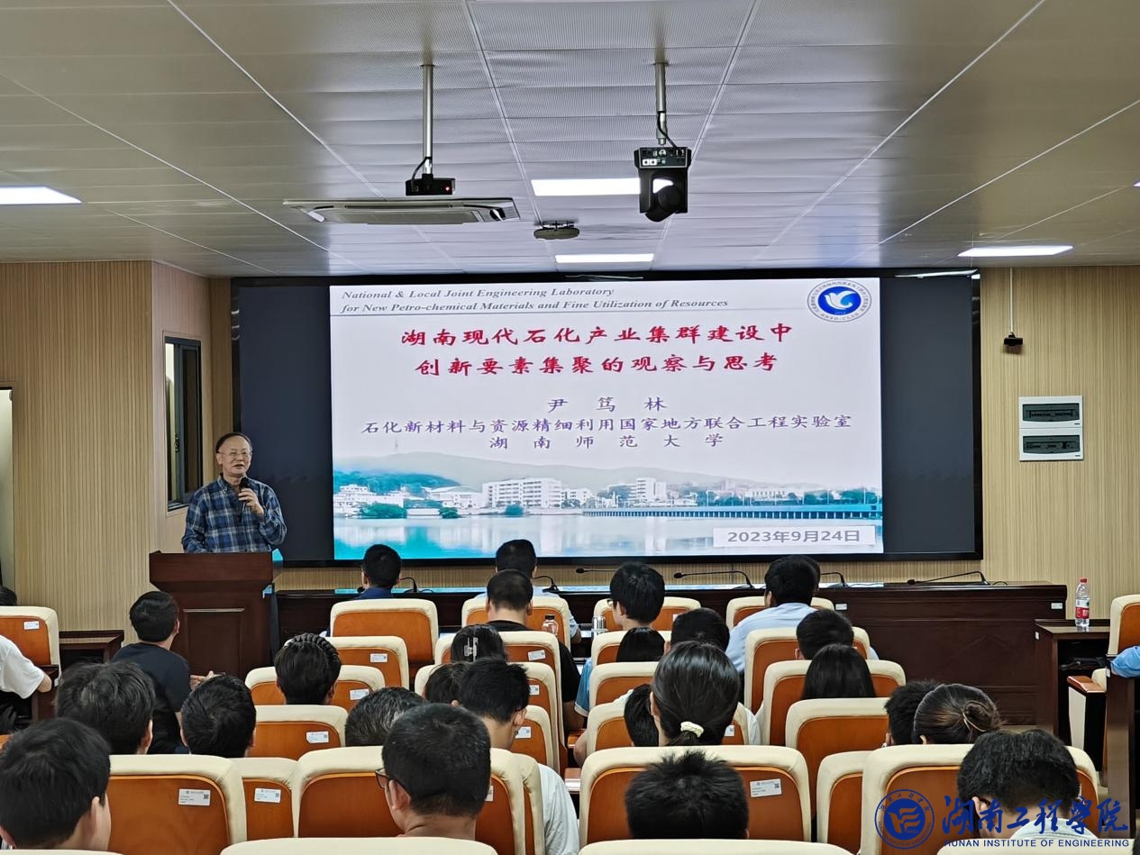 尹笃林教授是我国著名的化工专家,长期从事化工领域的教学和研究工作。在讲座中,尹笃林教授从“背景催人奋进”“政府创造环境”“企业引领创新”“学界融入产业”“在湖工的学与创”等5个方面详细介绍了湖南现代石化行业的现状和发展趋势。他指出,湖南作为我国重要的石油化工产业基地之一,具有广阔的发展前景。随后,尹笃林教授详细讲解了政府、企业、学界在石化产业发展中的重要性,并列举了一些湖南省在石化领域取得的创新项目和成果,他激励同学们要全面发展,积极投身和参与社会实践,努力用国有原材料去解决企业的“卡脖子”技术问题。