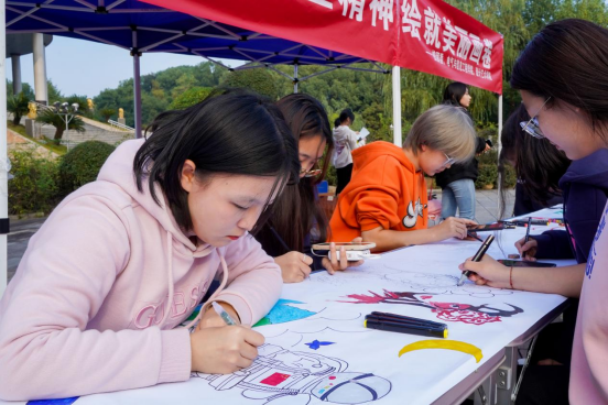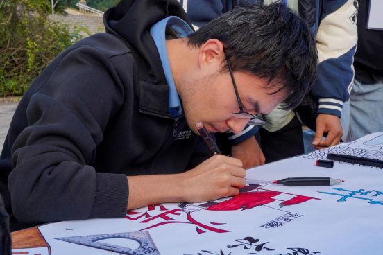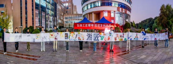 活动现场,学子们策划、起笔、勾线、填色,他们聚精会神地用笔触勾勒着轮廓线条。自动化2301班的谢同学在画鲁班锁,她说道:“我觉得鲁班锁的精巧和缜密,展现了执着专注、精益求精的工匠精神。”设计艺术学院的学生集思广益,他们认为湖湘文化与湖湘传统技艺共同孕育的湖湘工匠精神有非常鲜明的特点,因此他们手拿画笔,专注地在画纸上挥毫泼墨,经过近3个小时的努力,“湘匠”二字跃然纸上,生动再现了当时匠人们专注于手工技艺的场景。还有同学在卷中写字,挥毫写下了“工匠精神”四个大字。活动现场还展览了学生已有的工匠作品,吸引了很多人的驻足。现场还邀请观看的同学一起参与,共绘画卷,一个个灵动的图案在画卷上涌现,一幅幅精彩的作品呈现在画卷上。