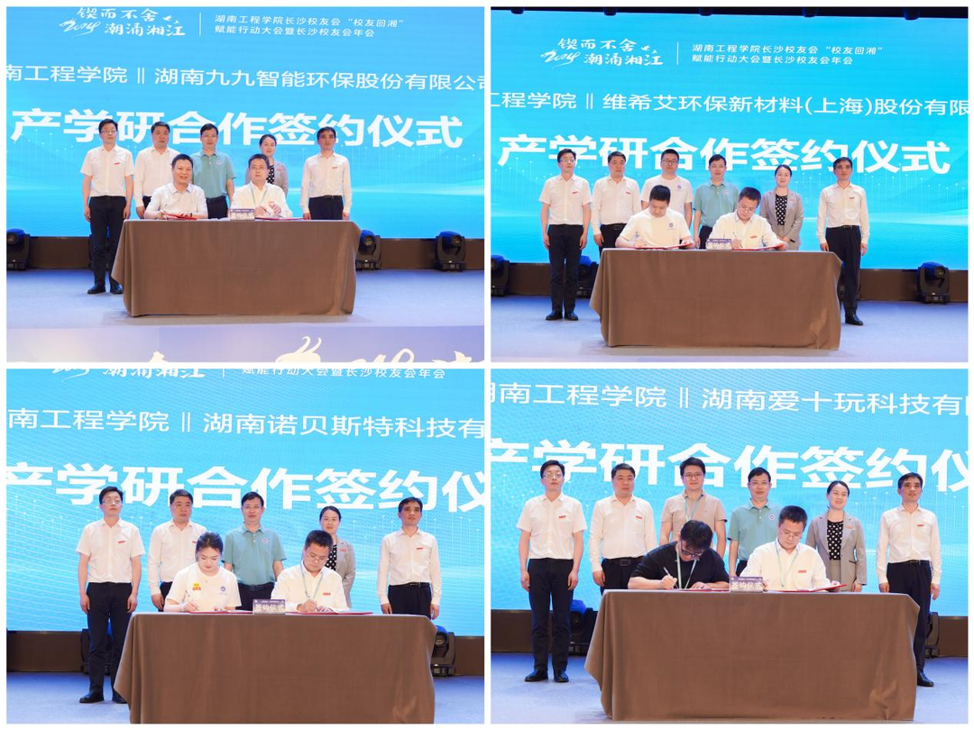 会上,taptap点点体育分别与湖南九九智能环保股份有限公司、维希艾环保新材料(上海)股份有限公司、湖南诺贝斯特科技有限公司、湖南爱十玩科技有限公司签订了产学合作协议。学校校友联络中心主任张宏宣读了新增理事成员名单,与会领导为新增理事成员颁发证书。