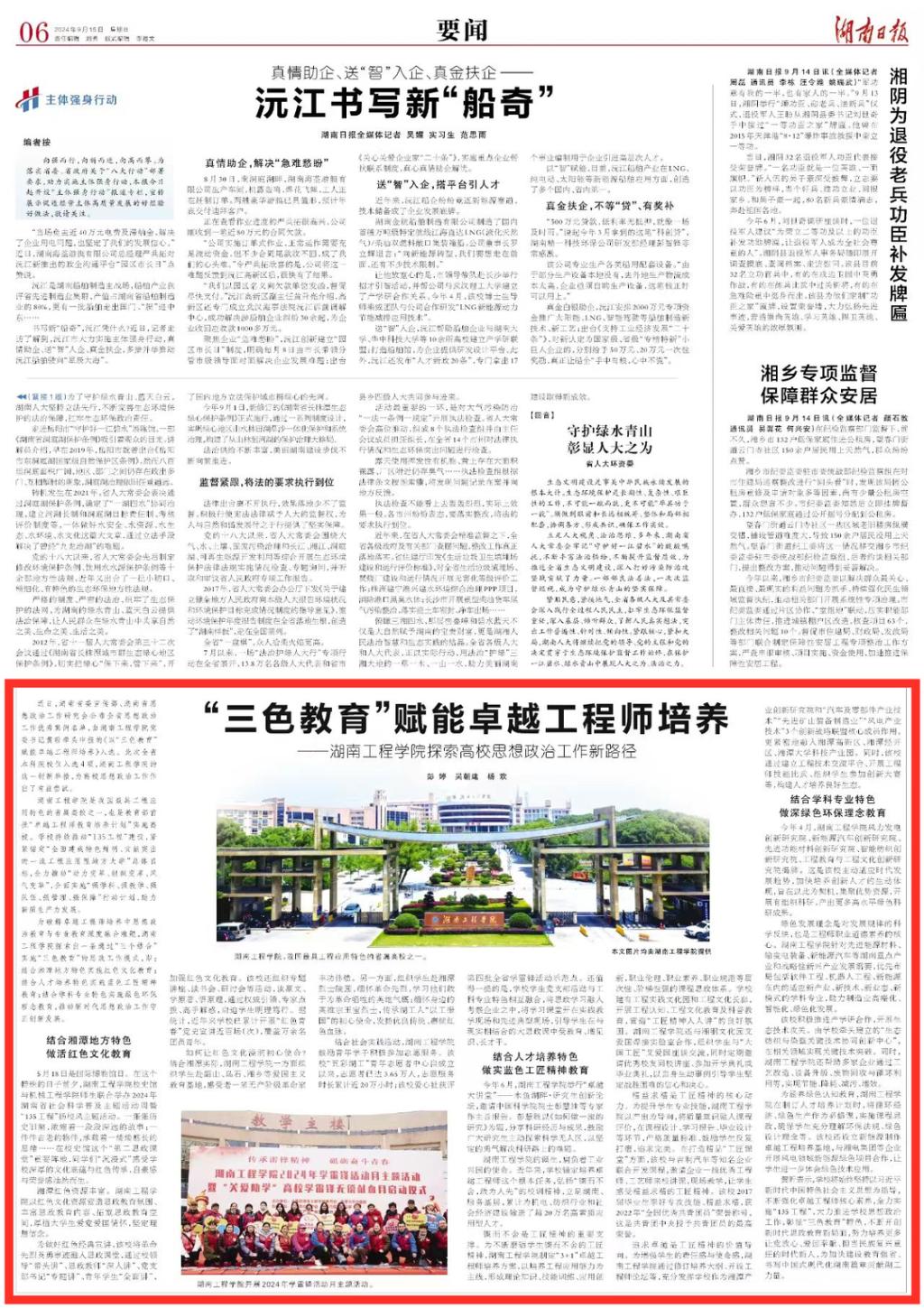 为破解卓越工程师培养中思想政治教育与专业教育深度融合难题,taptap点点体育探索出一条通过“三个结合”实施“三色教育”的思政工作模式,即:结合湘潭地方特色实施红色文化教育;结合人才培养特色实施蓝色工匠教育;结合学科专业特色实施绿色环保教育,推动新时代思想政治工作守正创新发展。