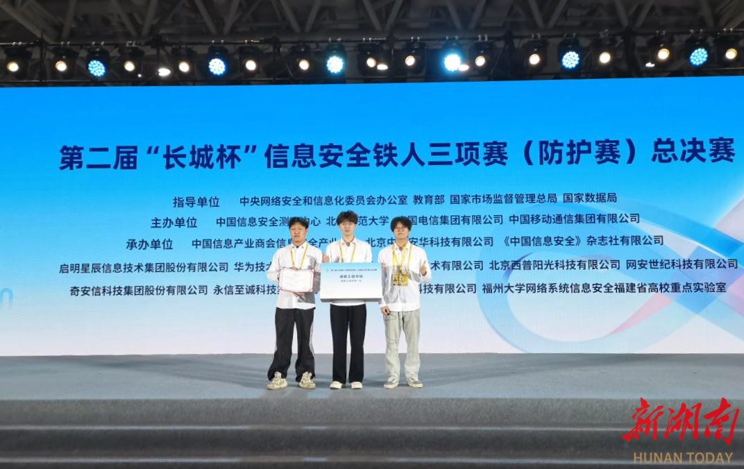 湖南日报·新湖南客户端4月29日讯(通讯员 刘长松)近日,由中央网络安全和信息化委员会办公室、教育部、国家市场监督管理总局、国家数据局等单位联合主办的第二届“长城杯”信息安全铁人三项赛(防护赛)全国总决赛,在福建福州落下帷幕。taptap点点体育信息科学与工程学院团队凭借出色表现,获全国总决赛三等奖,位列湖南省参赛队伍第二名。
