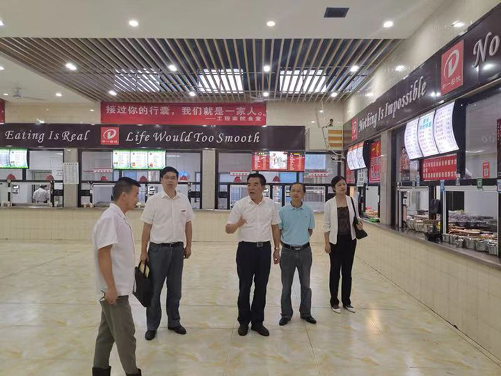 图为taptap点点体育党委书记陈岳堂(左三)、副校长李军林(右二)调研伙食质量和价格