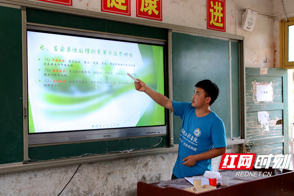 环保课堂上,大学生们正用ppt向孩子们开展环保宣传。